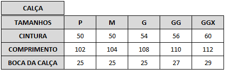 A calça possui regulagem na cintura através de elástico e cordão com ponteiras de PVC para acabamento. Modelo fornecido opcionalmente com ou sem faixas refletivas de 50 mm circulando as pernas. As faixas refletivas utilizadas atendem a NBR 15292 (Vestimentas de Segurança de Alta Visibilidade).